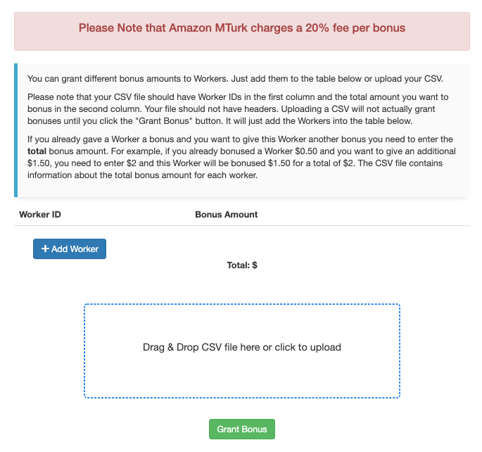 When granting bonuses, there are a few things to be aware of. First, MTurk charges a 20% fee on all bonuses granted to workers. Second, the amount you bonus workers is cumulative within any one HIT. This means if you are granting bonuses to workers for multiple reasons in the same study, you will have to add the amount you wish to bonus the worker to whatever accumulation of bonuses you may have given that worker already. Put simply, for a worker you wish to give a $1 bonus to and who has received $1 from you already, you will need to enter the bonus amount as $2.